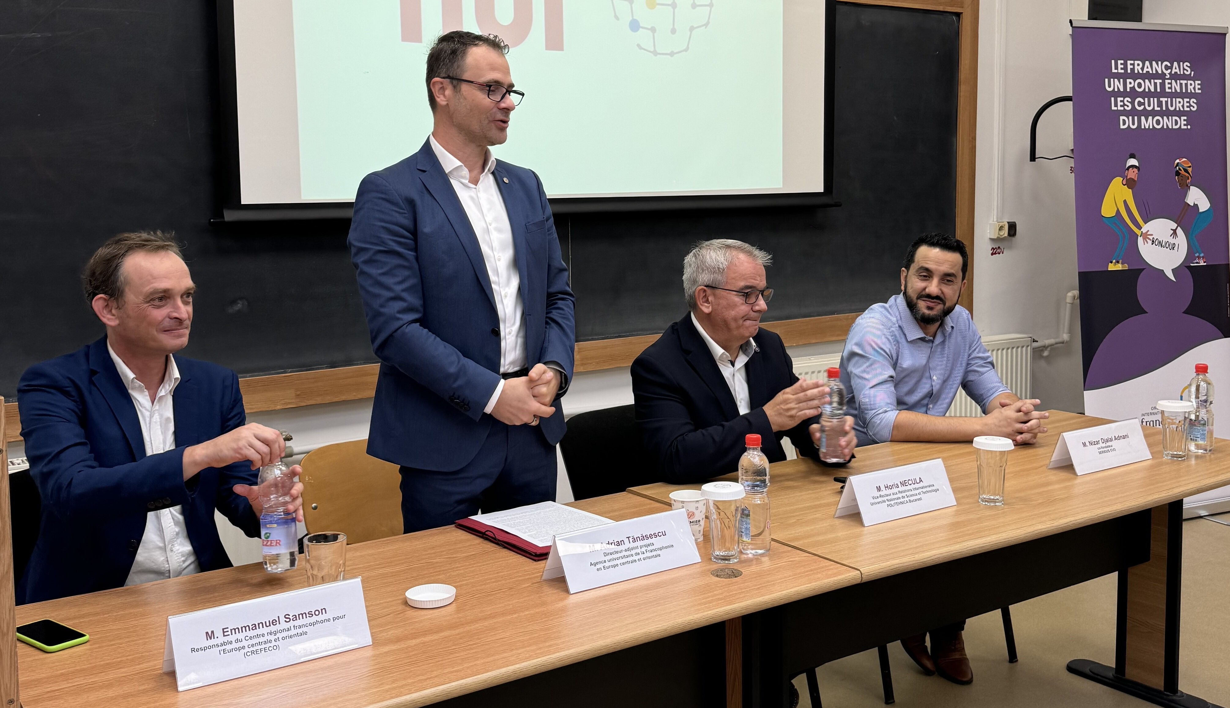 M. Emmanuel SAMSON (Responsable du CREFECO), M. Adrian Tanasescu (Directeur-adjoint du Bureau de l’AUF en Europe centrale et orientale), M. Horia NECULA (Vice-Recteur de l’UNSTP Bucarest), M. Nizar Djalal Adnani (Co-fondateur de Serious Evo International)