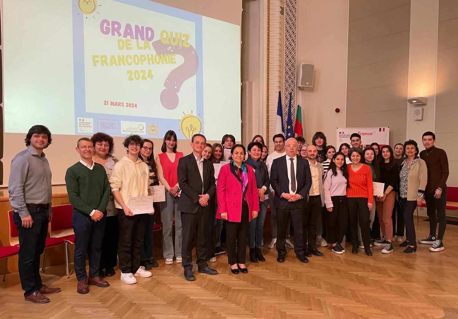 Jeudi 21 mars, neuf équipes se sont affrontées dans le Grand Quiz de la Francophonie organisé par l’Institut français de Bulgarie en partenariat avec l’Ambassade du Maroc en Bulgarie et le CREFECO. 27 élèves de différents établissements ont répondu à une série de questions sur la Francophonie et les pays francophones selon différentes thématiques (arts et culture, histoire, expressions francophones, gastronomie, politique, ou sports). Sous la responsabilité du jury composé de Zakia El Midaoui, Ambassadrice du Maroc et Présidente du Groupe des ambassadeurs francophones de Bulgarie, Jérôme Kelle, Conseiller politique à l’Ambassade de France en Bulgarie et Emmanuel Samson, Responsable du CREFECO, c’est l’équipe du Lycée Lyudmil Stoyanov de Blagoevgrad qui a remporté le quiz et est reparti avec des prix offerts par l’OIF.