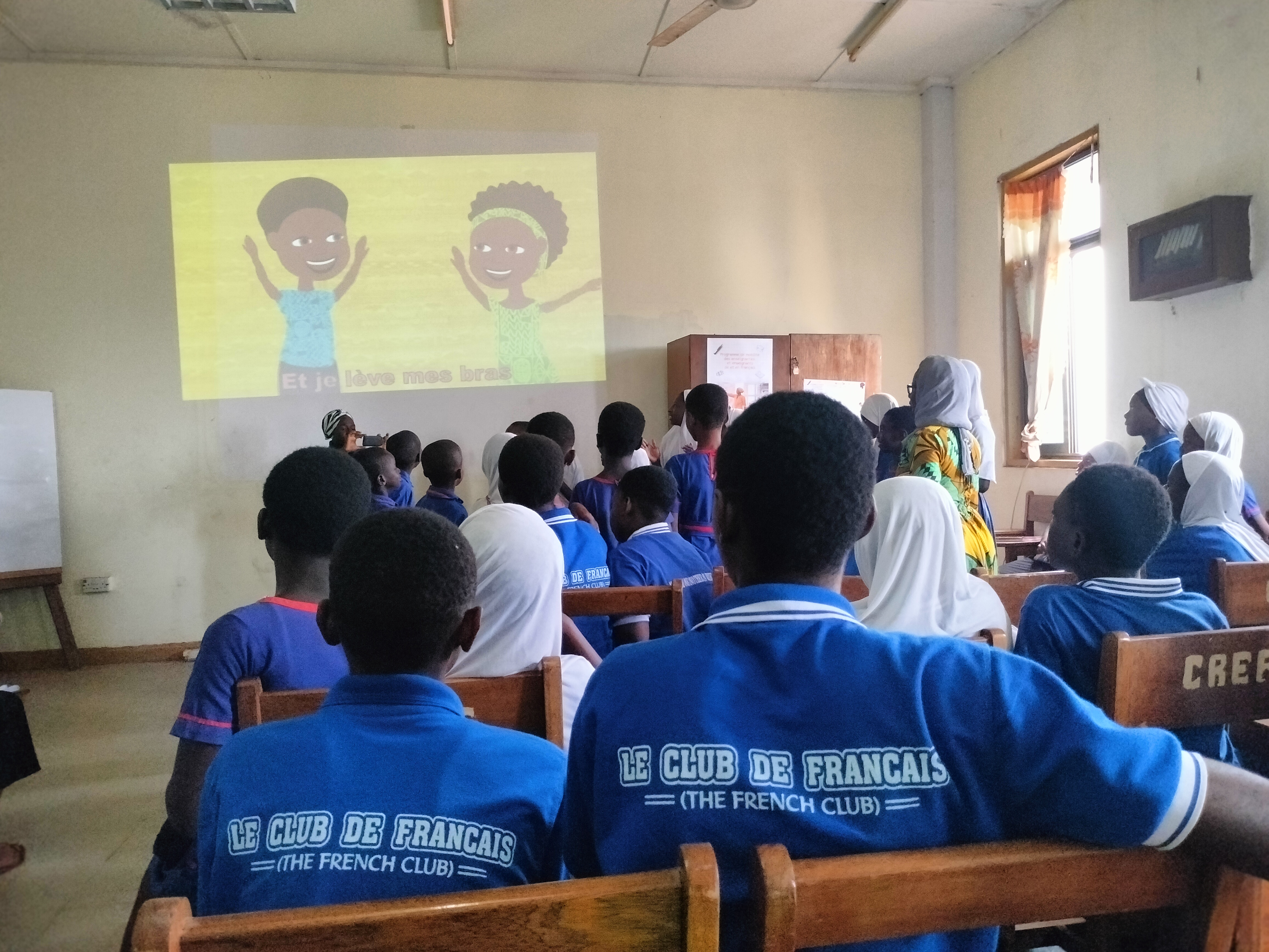 De même, les membres du club français de TI Ahmadiyya, sous la houlette de leur enseignante de français et en collaboration avec les VOIF, ont eu droit à trois jours de célébration avec au menu : concours de gastronomie francophone, concours de lecture, dictée, chant et débat. Ces 28 filles et 9 garçons ont démontré leur fierté d’être francophones. Le CREF de Takoradi a également reçu la visite de 26 membres (2 garçons et 24 filles) du club français de l’école Prestea Goldfields School accompagné(e)s de leurs deux enseignants. Chansons, poèmes, jeux et projection du court-métrage MACHINI ont meublé cette journée.
