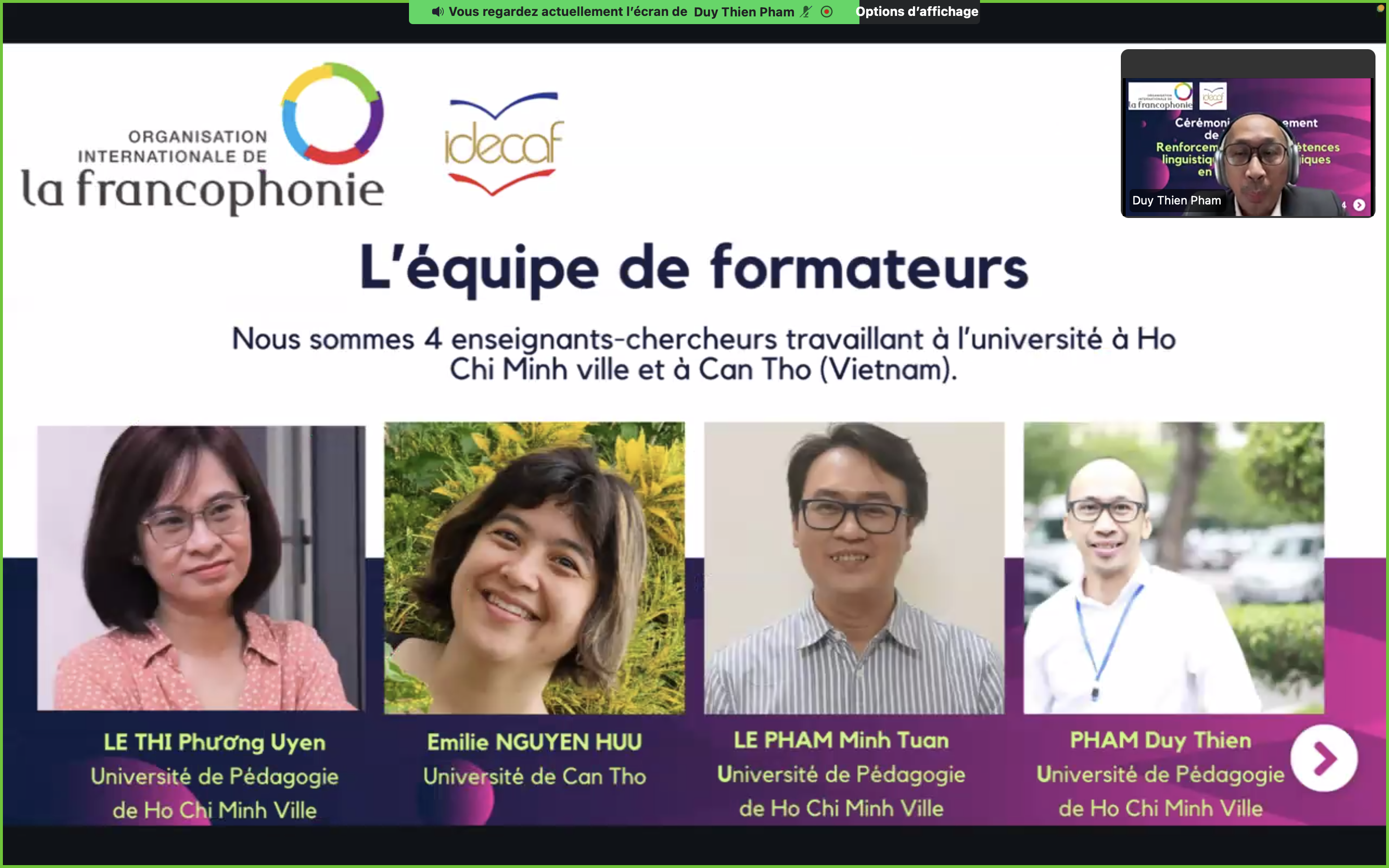 Ce programme de formation, assuré par des enseignants de l’Université de Pédagogie de Hô Chi Minh-Ville et de l’Université de Cân Tho, se déroulera sur une période de 12 semaines et sera intégralement dispensé à distance. Chaque semaine, les participants suivront 4 heures de cours en mode synchrone, complétées par 1 à 2 heures d’apprentissage en autonomie.