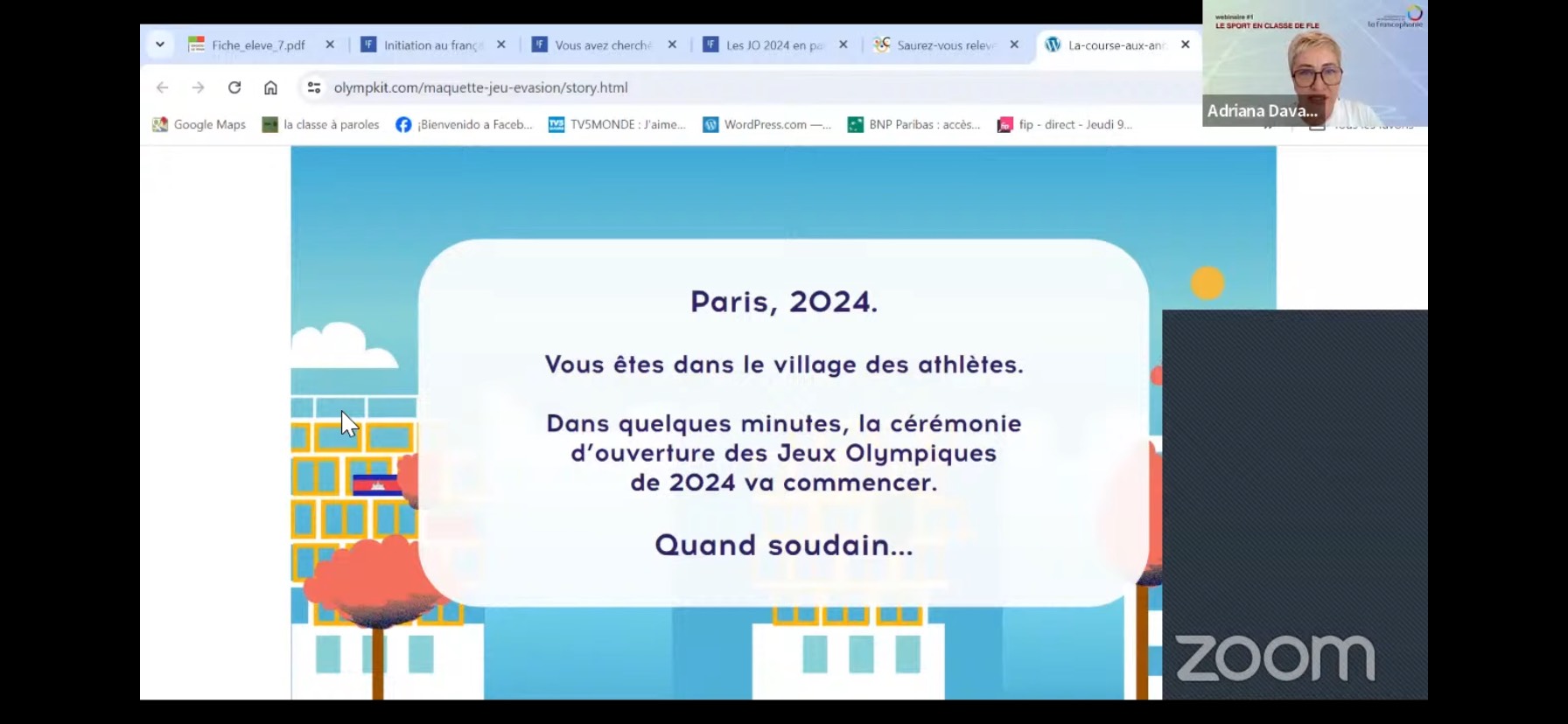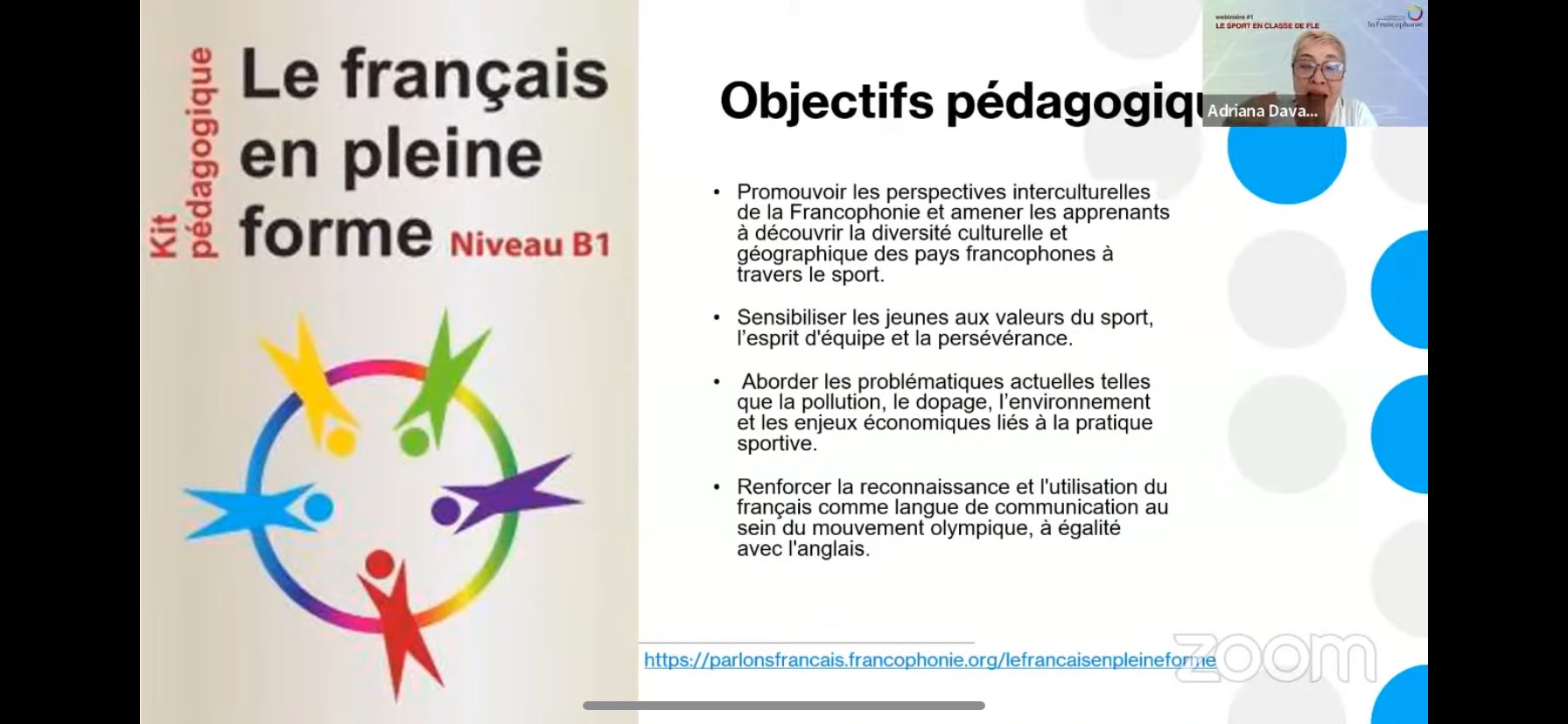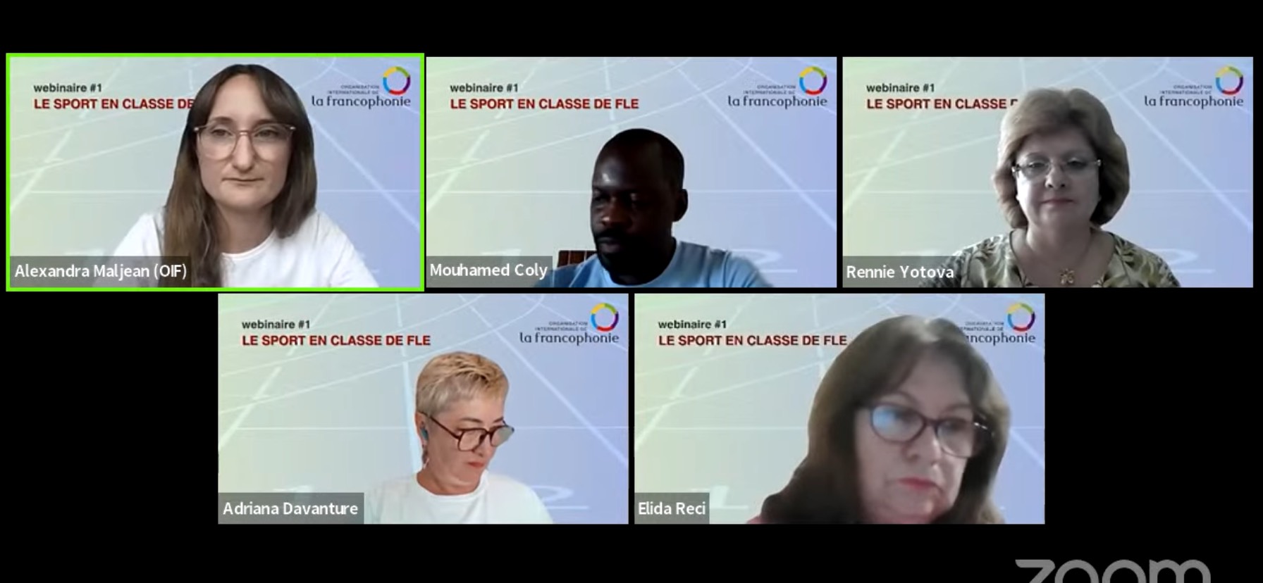 Le coup d’envoi de cette série a été donné le 25 juillet, la veille du lancement des Jeux Olympiques 2024 à Paris, avec le webinaire intitulé « Le sport en classe de FLE ». Cet événement a attiré 635 enseignant(e)s venant de 75 pays, qui ont participé à une heure et demi de formation et d’échanges d’informations. Adriana Davanture, experte au service du programme pour le français dans les organisations internationales, a animé la session avec la participation de Mouhamed Coly, enseignant volontaire de l’OIF au Rwanda, qui a témoigné de l’utilisation de Olymp’kit, dispositif pédagogique développé par le CAVILAM-Alliance française à l’initiative de la Fédération internationale des professeurs de français (FIPF) et soutenu par l’Organisation internationale de la Francophonie (OIF) et Elida Reci, formatrice de formateurs en Albanie, membre de l’équipe des concepteurs du kit pédagogique de l’OIF « Le français en plein forme » accessible à toutes et tous sur la plateforme Parlonsfrancais.francophonie.org.