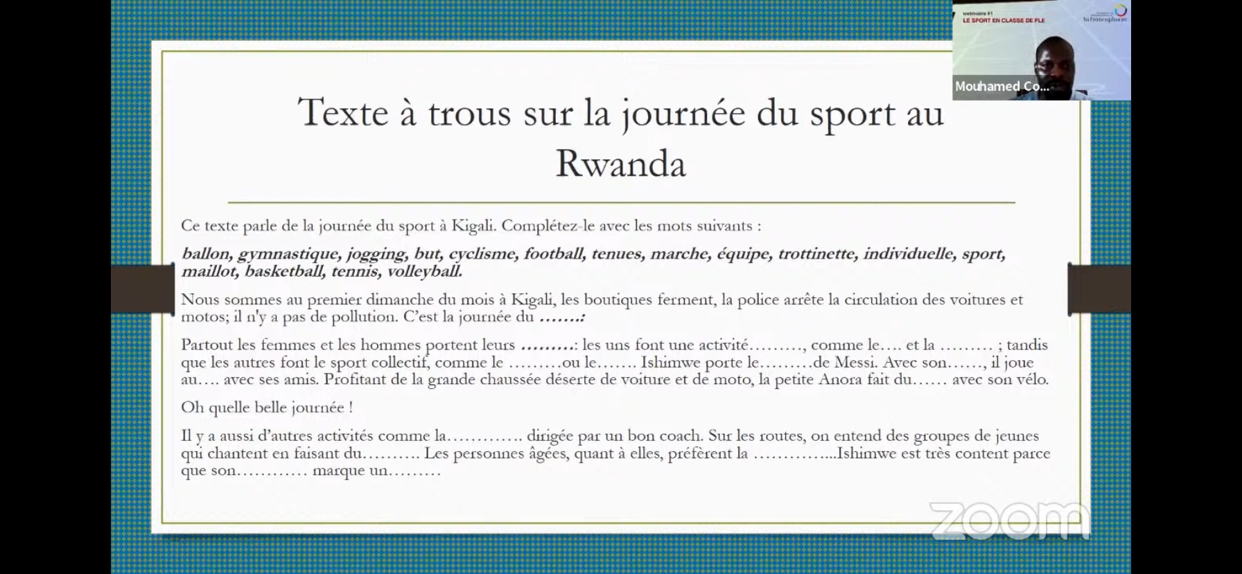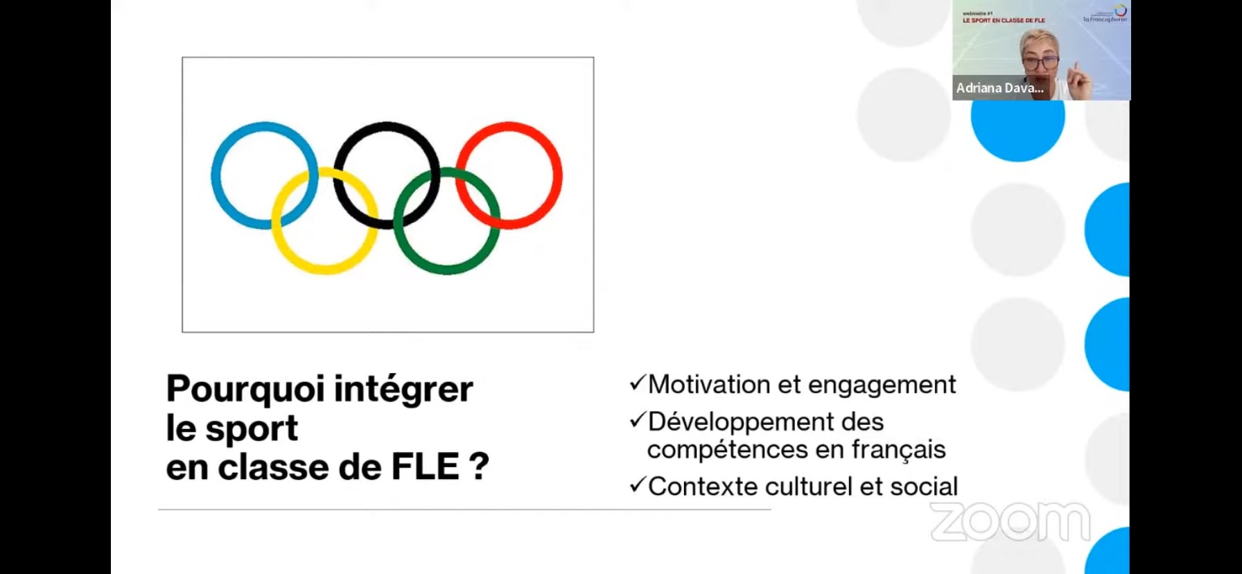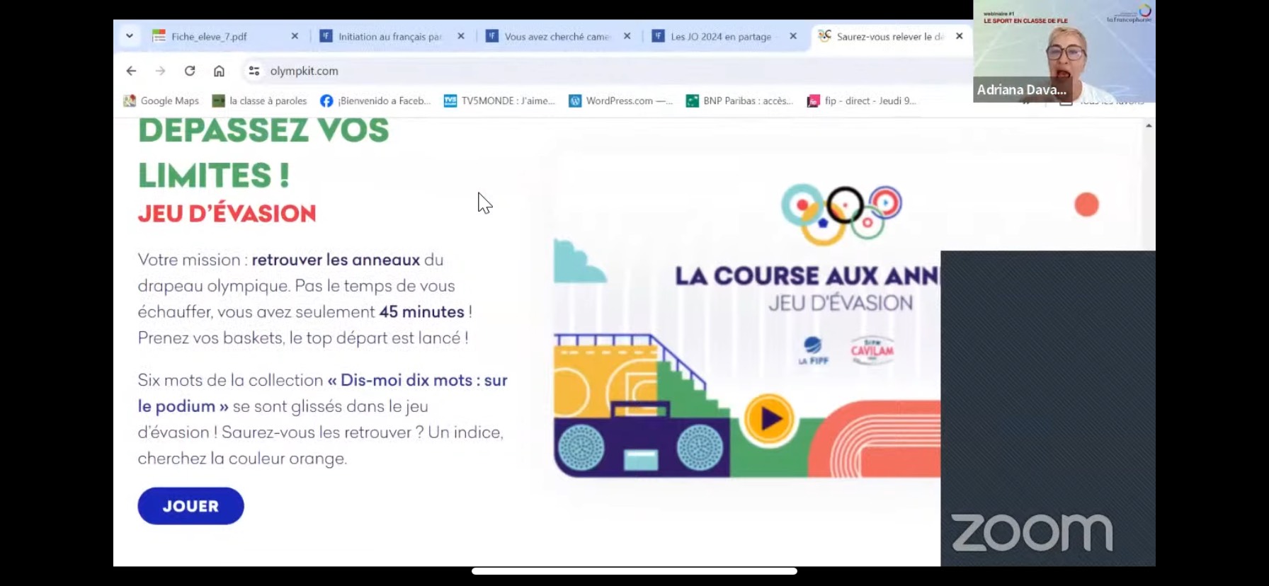 Le coup d’envoi de cette série a été donné le 25 juillet, la veille du lancement des Jeux Olympiques 2024 à Paris, avec le webinaire intitulé « Le sport en classe de FLE ». Cet événement a attiré 635 enseignant(e)s venant de 75 pays, qui ont participé à une heure et demi de formation et d’échanges d’informations. Adriana Davanture, experte au service du programme pour le français dans les organisations internationales, a animé la session avec la participation de Mouhamed Coly, enseignant volontaire de l’OIF au Rwanda, qui a témoigné de l’utilisation de Olymp’kit, dispositif pédagogique développé par le CAVILAM-Alliance française à l’initiative de la Fédération internationale des professeurs de français (FIPF) et soutenu par l’Organisation internationale de la Francophonie (OIF) et Elida Reci, formatrice de formateurs en Albanie, membre de l’équipe des concepteurs du kit pédagogique de l’OIF « Le français en plein forme » accessible à toutes et tous sur la plateforme Parlonsfrancais.francophonie.org.