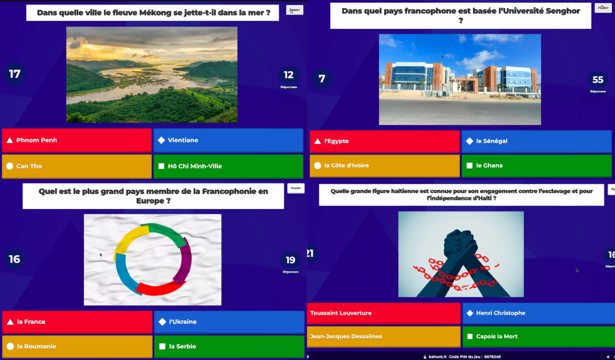 Du 18 au 21 mars, ces quiz ont rassemblé en ligne sur Zoom et Kahoot 770 élèves de 19 pays de l’espace francophone : Albanie, Arménie, Cambodge, Egypte, Géorgie, Ghana, Macédoine du Nord, Madagascar, Mexique, Qatar, République de Moldavie, Roumanie, Rwanda, Sénégal, Seychelles, Sri Lanka, Tchad, Thaïlande, Vietnam.