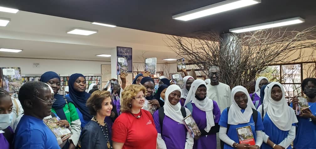Rennie Yotova, Alya Jaafar, Directrice de la Librairie aux 4 Vents, Magueye Toure, Abdrahmane Djimbera, professeur de français avec ses élèves du Lycée d’excellence Mariama Ba de Gorée.